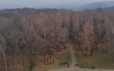 Na miejscu porobiłem fotki i zacząłem się zbierać w drogę powrotną, szczególnie że pogoda wyraźnie zaczęła się psuć. Zaszło słońce i zrobiło się zimno. Żeby nie powtarzać znanych dróg, do zjazdy wybrałem szlak czerwony (pieszy) do Chełmu. To był niestety błąd, szlak jest wąski, stromy i na dodatek pod górę szło mi sporo osób, dużą część drogi musiałem zwyczajnie pokonać na nogach. Po wyjechaniu na asfalt, ruszyłem w kierunku centrum Krakowa, przejechałem przez Błonia, porobiłem fotki budynku Sokoła i pomnika Piłsudkiego znajdującego się w pobliżu, w końcu dojechałem do rynku w Krakowie. Dalej było zimno, więc bez dłuższych postojów ruszyłem do domu.