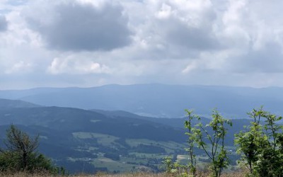 Plan na dzisiaj był ambitny - start i meta w Jurkowie i duża pętla przez Ćwilin i Śnieżnice. Na początek niebieskim szlakiem na Ćwilin, niebo zachmurzone, w powietrzu mega duszno, ale drogi ubywało szybko i po godzinie byłem na miejscu. Na Ćwilinie zrobiłem przerwę na polanie widokowej (Polanie Michurowej) - dzisiaj niestety przejrzystość powietrzna nie była za wysoka, więc Tatr nie było widać i musiałem się zadowolić widokami na szczyty Beskidu Wyspowego i Gorców.
