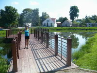 Szosą 793 w kierunku Złotego Potoku przejechaliśmy jakieś 2 km i następnie skręciliśmy w lewo na Siedlec. Odcinek do Siedlca był dość przyjemny, droga co prawda nie najlepsza prowadziła jednak przez las, nie było większych podjazdów, więc można było odpocząć po trudach drogi siedleckiej. Z Siedlca, brzegiem Pustyni Siedleckiej pojechaliśmy do Zrębic, gdzie znajduję się zabytkowy drewniany kościół i dzwonnica - niestety pod kościołem remont drogi i placu, więc znowu sesja zdjęciowa się nie udała. Nadrobiliśmy to kilometr dalej nad stawkiem. Ze Zrębic do Olsztyna można jechać szlakiem przez las, ale po doświadczeniach z drogi siedleckiej pojechaliśmy asfaltem przez Biskupice. Wieś ta jest położona na pięknej widokowej przełęczy, ale dojazd tam wiązał się niestety ze sporym podjazdem. W nagrodę w stronę Olsztyna prowadziły już głównie zjazdy.