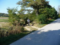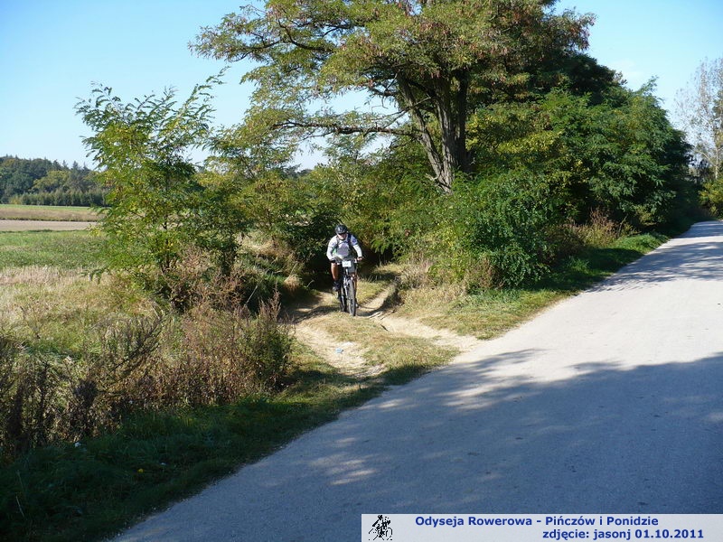 O godzinie dziesiątej ruszyli wszyscy zawodnicy - 27 ekip w kategorii rekreacyjnej - czyli naszej i co najmniej ze 100 zawodników w kategorii klasycznej. W pobliże punktu 2 dotarliśmy w większej grupie, ostatnie 500 metrów było do pokonania przecinką przez las, ale ta droga okazała się jedną wielką piaskownicą i pokonanie odcinka do punktu i z powrotem do drogi kosztowało nas trochę sił i sporo czasu. Po zaliczeniu punktu 2 ruszyliśmy na punkt pierwszy, początkowo przez wieś po asfalcie, ale już za chwilę wyszliśmy na otwarty teren prowadzący w kierunku lasu na tym odcinku poczuliśmy po raz tego dnia mocny czołowy wiatr. Krzysiek miał pewne problemy i kilka drużyn nam trochę uciekło. Po jakimś kilometrze jazdy pod wiatr wpadliśmy w las na drogę szutrową, droga była dobrze utwardzona, ale duże kamienie utrudniały jazdę. Punkt pierwszy znajdował się na prawo od tej drogi - jakieś 300 metrów musieliśmy pokonać leśną przecinką na szczęście tym razem bez piachu. Po chwili pędziliśmy już na punkt 6. Droga do niego prowadziła asfaltami przez miejscowość Michałów i dalej przez Zagajów, ten odcinek to parę ładnych kilometrów pokonanych częściowo pod wiatr. W Zagajowie skręciliśmy w lewo i rozpoczęliśmy podjazd, Krzysiek się trochę męczył, ale dość sprawnie go pokonał. Tuż przed szczytem trzeba było odbić w prawo w leśną ścieżkę, która miała nas zaprowadzić do punktu, droga ta była kręta i miejscami bardzo trudna. W drodze na ten punkt i na samym punkcie spotkaliśmy co najmniej kilka zespołów w tym zespół złożony z ojca i jego 11 letniego syna z którymi od tego miejsca rywalizowaliśmy aż do samego końca Odysei.
