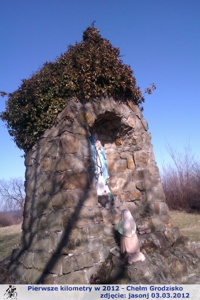 Wstałem rano patrzę świeci słońce, więc pomysłem może pojadę, ale potem patrzę 2 stopnie, wyszedłem - wiatr i zimno, więc nie jadę. Jednak około 13 grzejące od rana słońce spowodowało, że zrobiło się naprawdę ciepło. Biorę rower i jadę, powolutku w kierunku kościoła w Chełmie, jechało mi się strasznie ciężko, pierwszy podjazd wycisnął ze mnie pierwsze poty, stanąłem więc pod krzyżem i zrobiłem kilka fotek. Po kilku chwilach jadę dalej pod kościół w Chełmie, tu dwie fotki i jazda na Grodzisko po kocich łbach, początkowo ciągnąłem nie najgorzej, ale jak wjechałem na bruk to szybko się zorientowałem, że mam mało powietrza w kołach, obręcze dobijały do kamieni - 100 metrów przed szczytem musiałem więc zejść z roweru.