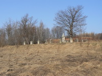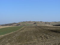 Postanowiłem wykorzystać swój nowy mapnik i jeszcze raz poszukać drogi na przełaj ze szczytu Czyżyczki do znajdującego się u stóp wzgórza cmentarza wojennego 337 w Grabinie. Tej drogi szukałem już kilkukrotnie bezskutecznie, ostatnio nawet doszedłem do wniosku, że nie da się zjechać wprost na ten cmentarz, ale mimo to postanowiłem spróbować. Ze szczytu Czyżyczki ruszyłem na przełaj przez pola i po chwili dotarłem do szutrowej drogi pomiędzy domami poniżej szczytu wzgórza, dalej skręciłem w lewo a później w prawo i pojechałem szutrową, wiodącą dość mocno w dół ścieżką, przez moment wydawało mi się, że w końcu dotrę na miejsce i byłem nawet już bardzo blisko, ale droga dość niespodziewanie zaczęła odwijać znowu w kierunku szczytu na domiar złego zostałem zaatakowany przez dwa dość spore psy z pobliskiego gospodarstwa, musiałem więc uciekać. Efekt był taki, że męcząc się strasznie wyjechałem znów w pobliże szczytu wzgórza, postanowiłem już więcej nie kombinować i zjechałem do Grabiny normalnie po asfalcie.