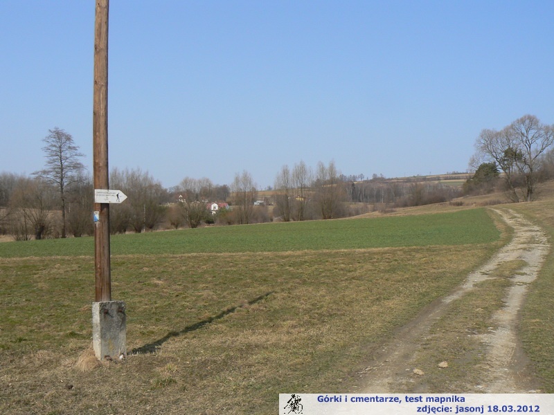 Za wspomnianym wyżej przystankiem kończy się najtrudniejszy odcinek podjazdu na Czyżyczkę, tuż za nim mamy wypłaszczenie z którego rozciągają się przepiękne widoki, więc znowu zrobiłem przerwę na fotki. Po wypłaszczeniu jeszcze jeden ciężki odcinek pod sklep do krzyżowania z drogą na Pogwizdów, i właśnie w tę drogę skręciłem, żeby dojechać do pobliskiego punktu widokowego na Łapczycę. Na punkcie kilka fotek pod panoramę Łapczycy i powrót do wspomnianego wyżej skrzyżowania i ostateczny atak na szczyt wzgórza Czyżyczka. Na szczycie znów sesja, sfotografowałem cmentarz wojenny 336, widoki w koło oraz mój właśnie ukończony mapnik - który szykuję na Miniodyseję w Miechowie (15.04.2012).