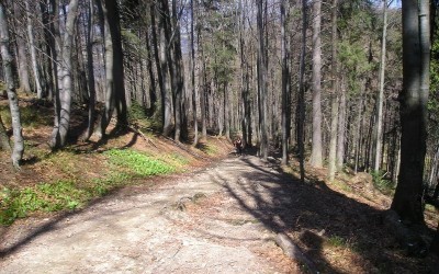 W drogę powrotną ruszyliśmy przez Czoło Turbacza (1259 m npm) szlakiem niebieskim do Koninek. Droga prowadziła w zasadzie tylko w dół, nie było jakiś dodatkowy podejść. Miejscami było dość stromo, w celu wygodniejszego schodzenia (podejścia) były porobione stopnie, jakby schody. Samo zejście w większości prowadziło prowadziło przez las, tylko na polanie Średnie 1070 m npm przez chwilę mieliśmy jeszcze piękne widoki.