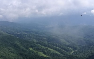Pierwszego dnia po 5 godzinach w autobusie, wysiedliśmy w Wetlinie i ruszyliśmy na Rabią Skałę (1199 m npm.), po drodze zdobyliśmy Jawornik i Paprotną. Na szczycie postanowiłem iść jeszcze na trochę niższy, ale za widokowy wierzchołek po stronie słowackiej, nawet udało mi się uchwycić całkiem ładną panoramę. W dół szliśmy bardzo podobną trasą, przez Paprotną, Jawornik i stąd innym szlakiem do Wetliny.