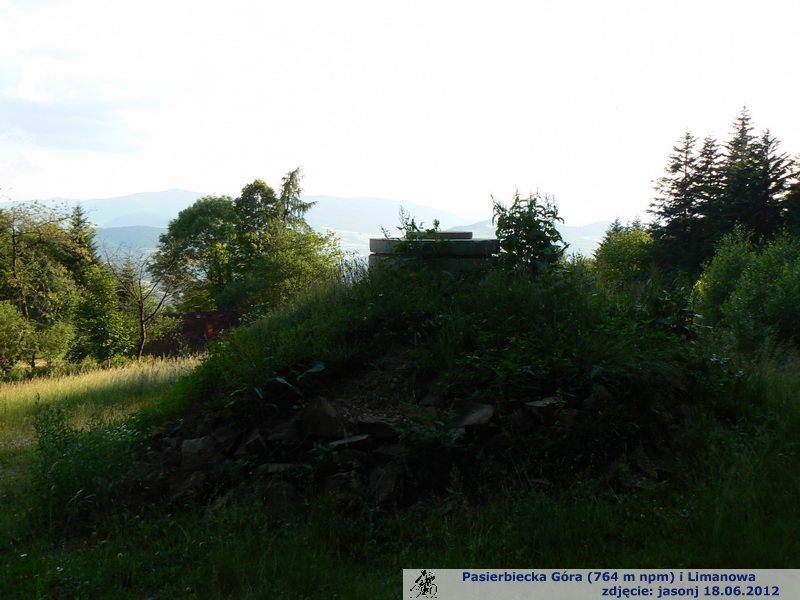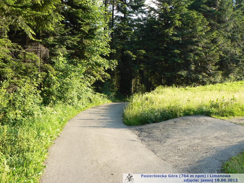 Skręcamy i po chwili przejeżdżamy po moście, od tego momentu liczy się podjazd, pierwsze metry jeszcze stosunkowo płasko, ale już po chwili droga zaczyna się wyraźnie wznosić, kręciłem więc sobie powoli. Droga jest dobra, więc mimo sporego nachylenia jedzie się dobrze. Kilka zakrętów na których nachylenie wyraźnie wzrasta, od drogi którą jedziemy odchodzą mega strome nitki asfaltu w lewo na Walową Górę i trochę dalej na Balażówkę a po kolejnym zakręcie dojeżdżamy do wypłaszczenia. Po prawej widać jak na dłoni Pasiebiecką Górę i Kamionną a po lekkim zjeździe dojeżdżamy do Sanktuarium Maryjnego. Zaraz za kościołem znowu pod górę i po kolejnych 400 metrach nasza droga zakręca w prawo, natomiast na wprost widać wąską nitkę asfaltu chowającą się powoli w lesie. To właśnie tą drogą należy jechać, po wjeździe w las od razu robi się bardzo, bardzo stromo na dystansie kolejnego kilometra pokonujemy prawie 160 metrów różnicy wzniesień i dopiero gdy skończy się las i dojedziemy do zabudowań to robi się trochę lżej (wysokość jakiś 680 metrów npm). Za ostatnimi zabudowania kończy się asfalt, dalej prowadzi droga szutrowa, szlak żółty którym jechaliśmy łączy się z niebieski i właśnie mniej więcej tu w środku lasu na wysokości jakiś 740 m npm kończy się podjazd. Ja pojechałem jeszcze kawałek do kolejnej polanki, gdzie znajdują się jakieś zabudowania i zbiornik na wodę (widoczny też na mapie Beskidu Wyspowego). Dalej jadąc tą drogą powinniśmy dojechać na Kamionną, ale ja już dalej nie pojechałem, droga jest mocno kamienista i na moim rowerze crossowym byłoby ciężko jechać. Rozpocząłem więc zjazd, zatrzymując się kilka razy w celu uzupełnienia dokumentacji fotograficznej:).