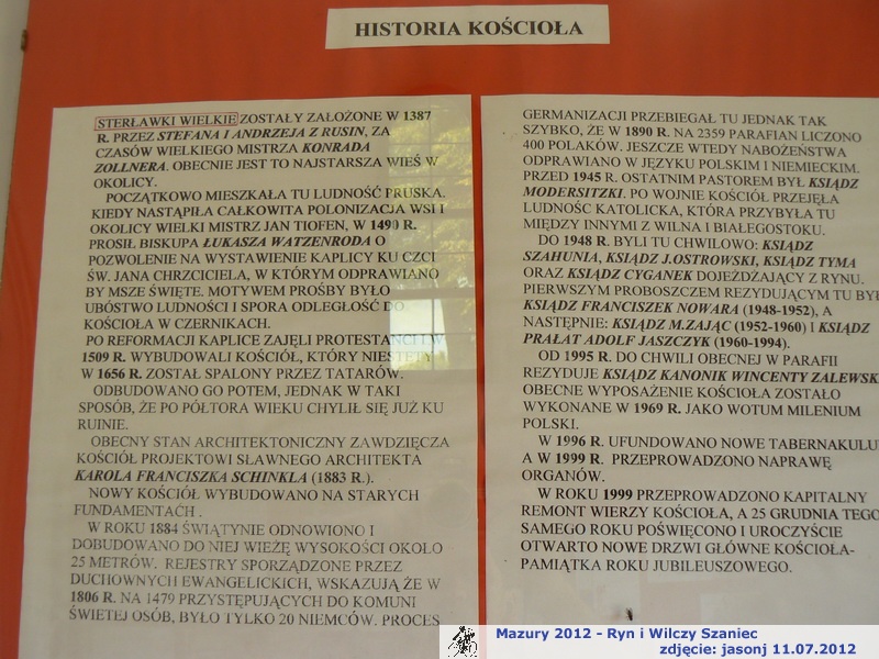 Po trzech dniach spędzony nad jeziorem Inulec, wstaliśmy rano, zapakowaliśmy sakwy i ruszyliśmy dalej na początek do Mikołajek. Przejechaliśmy przez miasto i boczną drogą wzdłuż jeziora Tałty ruszyliśmy w kierunku Rynu. W miejscowości Tałty zrobiliśmy krótki postój a następnie przejechaliśmy przez kanał Tałcki łączący jezioro Tałty z jeziorem Tałtowisko i ruszyliśmy dalej już szutrową drogą. Przejechaliśmy przez Skorupki obok pól biwakowych nad jeziorem Tałtowisko a następnie wyskoczyliśmy na asfaltową drogę nr 642, którą miała nas zaprowadzić do Rynu. Po kolejnych kilku kilometrach jazdy dojechaliśmy do Rynu leżącego nad jeziorem Ryńskim. W Rynie znajduje się oczywiście port oraz zamek krzyżacki z XIV wieku. Z pierwotnego wyglądu zamku niewiele pozostało, a w obecnym zamku znajduję się hotel i restauracja, teren wokół zamku można zwiedzać, więc porobiliśmy kilka zdjęć. Z Rynu ruszyliśmy dalej drogą nr 642 w kierunku Sterławek Wlk. Po jakiś 10 km byliśmy w Sterławkach przez które przebiega dość ruchliwa droga z Giżycka do Kętrzyna. W tej miejscowości zrobiliśmy postój na drugie śniadanie, ja zrobiłem kilka fotek kościoła i po uzupełnieniu zapasów ruszyliśmy dalej drogą w kierunku Kętrzyna.
