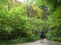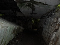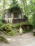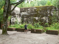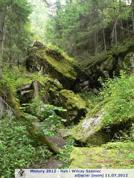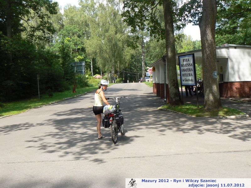 Ruchliwą drogą na Kętrzyn musieliśmy przejechać ładne parę kilometrów przez Martiany i Pożarki dojechaliśmy do miejscowości Kwiedzina, gdzie mieliśmy odbić w leśną drogę do Gierłoży. Na mapie ta droga była oznaczona jako asfaltowa, tym czasem w miejscu gdzie miała być droga był szuter, więc pojechaliśmy kawałek dalej w poszukiwaniu właściwej drogi, ale okazało się, że to jednak była ta droga, więc wróciliśmy do niej i ruszyliśmy do Gierłoży. Droga rzeczywiście była utwardzona, ale nie asfaltem a brukiem z kamieni w rezultacie jechało się nią bardzo ciężko i powoli. Do Gierłoży mieliśmy do pokonania ledwie 4 km ale jechaliśmy ten odcinek dość długo, ale za to wyjechaliśmy wprost na Wilczy Szaniec - czyli dawną kwaterę Hitlera na Mazurach. Kwaterę tą zbudowano dla celów wojny z ZSRR podczas której to właśnie na Mazurach w kilku takich kwaterach znajdowało się dowództwo wszystkich rodzajów wojsk. Ponieważ wojna z ZSRR się przedłużała to Hilter w Wilczym Szańcu spędził ponad 800 dni (najwięcej podczas wojny). To tu został przeprowadzony na niego zamach zobrazowany w filmie Walkiria z Tomem Cruisem. Obecnie na terenie Wilczego Szańca za odpowiednią opłatą - 15 zł można zwiedzać pozostałości bunkrów (większość z nich wysadzono i są w ruinie). Ponieważ chcieliśmy w tym miejscu przenocować zapytaliśmy o nocleg. Okazało się, że za 100 zł (za pokój 2 osobowy) możemy przenocować w hotelu mieszczącym się w dawnym budynku Gwardii Przybocznej, biorąc taką opcję mieliśmy wstęp za darmo i śniadanie na drugi dzień gratis, w przypadku noclegu ja polu namiotowym trzeba zapłacić za wstęp, za nocleg na polu i oczywiście o żadnym śniadaniu za free nie ma mowy, wybraliśmy więc hotel.