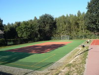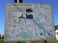 Po 21 km wyjeżdżam z Puszczy, przekraczam Rabę kładką w Mikluszowicach i kieruję się na Okulice. Na otwartym terenie jest mi trochę cieplej, powoli zbliża się godzina 9:00. Jednak powoli zaczynam też czuć delikatny wiaterek wiejący ze wschodu, a więc mi prosto w twarz - tego właśnie obawiałem się najbardziej. Tablice szlaku fotografuję na wjeździe na Żubrostradę, potem w Mikluszowicach na Górze św. Jana i pod kościołem w Okulicach. Bratucicach szlak skręca na Rudy Rysie, jest jednak znak że 180 metrów dalej jest miejsce wypoczynkowe na szlaku - jadę więc zobaczyć. Faktycznie przy boisku sportowym są ławeczki, informacja o szlaku i nawet toy-toy - nie sprawdzałem czy otwarty.