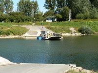 Prom nie pływa, ale Dunajec trzeba przekroczyć, najbliższy prom w Wietrzychowicach, jadę drogą wzdłuż wału i po kilkunastu minutach jestem na miejscu. Prom jest czynny i darmowy, stoi co prawda na drugim brzegu, ale zaraz za mną przyjeżdżają dwa samochody i prom płynie po nas. Przekraczam Dunajec i jadę dalej, żeby wrócić na szlak trzeba jechać na południe do Otfinowa, znowu jest pod wiatr. Ja mam w planie odwiedzić kolejny cmentarz, więc nie dojeżdżam do szlaku, robię skrót przez łąki i wyjeżdżam na drogę 973 i już po chwili jestem pod największym z oglądanych dziś cmentarzy, jest to samodzielny duży obiekt w Otfinowie oznaczony nr 252.