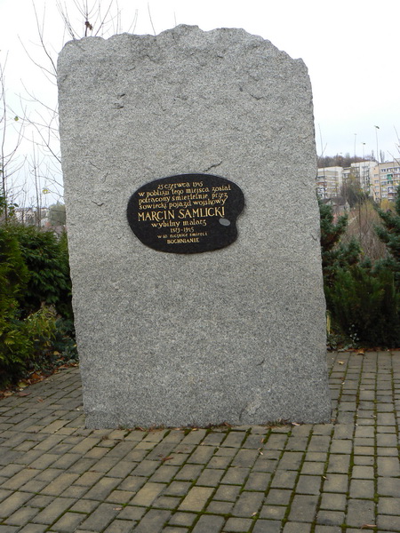 Z Łapczycy ruszyłem do Bochni drogą nr 4 i po podjeździe zacząłem zjazd do centrum Bochni. Zatrzymałem się na skrzyżowaniu z drogą na Nowy Wiśnicz w pobliżu, którego znajduję się kapliczka i pomnik Marcina Samlickiego - malarza i kolorysty, który zginął w tym miejscu 1945 r. rozjechany przez samochód żołnierzy radzieckich. Przejeżdżałem koło tego miejsca wiele razy, ale dzięki geocachingowi dowiedziałem o istnieniu kogoś takiego jak Marcin Samlicki. Z samym znalezieniem kesza, niestety miałem problem, nie wgrałem punktu do urządzenia i nie miałem dokładnych współrzędnych punktu. Oczywiście zatrzymałem się i rozglądnąłem, ale od razu stwierdziłem, że jest to kesz którego nie lubię - czyli ukryty gdzieś w krzakach lub w ziemi. Pomnik obsadzony jest jakimiś krzakami, a poniżej niego rosną też drzewka i krzaki - bez dokładnych współrzędnych szkoda czasu na szukanie.